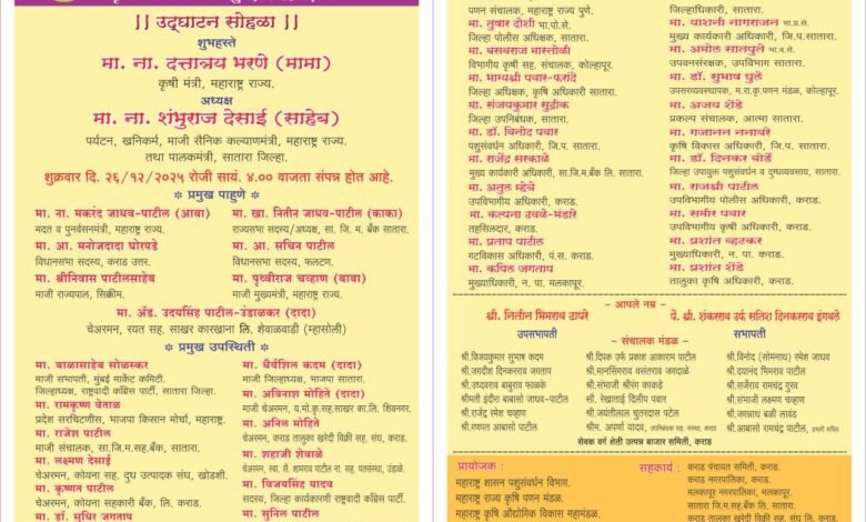 या प्रदर्शनाचे उद्घाटन महाराष्ट्र राज्याचे कृषिमंत्री नामदार दत्तात्रय भरणे यांच्या शुभहस्ते व सातारा जिल्ह्याचे पालकमंत्री, पर्यटन व खनिकर्म मंत्री नामदार शंभूराज देसाई यांच्या अध्यक्षतेखाली संपन्न होणार आहे, अशी माहिती शेती उत्पन्न बाजार समितीचे सभापती सतीश इंगवले व उपसभापती नितीन ढापरे यांनी दिली.