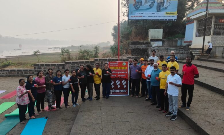 कराड प्रतिनिधी :– याबाबत अधिक माहिती अशी की रथसप्तमी निमित्त कराड येथील प्रितीसंगम घाटावर येथे हर्बललाईफ नूर्टेशन सेंटर व फिटनेस स्टुडिओ सेंटर यांच्या वतीने १११ सुर्य नमस्कार घालण्यात आले.
