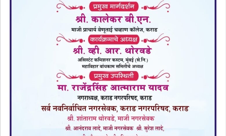 या कार्यक्रमाचे प्रमुख मार्गदर्शक वेणूताई चव्हाण कालेजचे माजी प्राचार्य बी.एन.कालेकर असून कार्यक्रमाचे अध्यक्ष महाविहार बांधकाम समितीचे अध्यक्ष व्ही.आर.थोरवडे तर प्रमुख उपस्थिती कराड नगरपालिकेचे नगराध्यक्ष श्री.राजेंद्रसिंह यादव व कराड नगरपालिकेचे नवनिर्वाचित नगरसेवक यांचीही उपस्थिती राहणार आहे. तसेच माजी नगरसेवक शांताराम थोरवडे, आनंदराव लादे, सुरेश लादे, प्रवीण लादे, विजय लादे यांच्यासह विविध मान्यवर उपस्थित राहणार आहेत. तरी या जाहिर व्याख्यानास मोठ्या संख्येने उपस्थित राहण्याचे आवाहन रमाई महिला मंडळाच्या सचिव सारिका लादे यांनी केले.