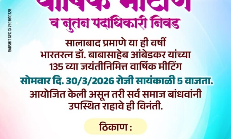 सालाबादप्रमाणे याही वर्षी भारतरत्न डॉ बाबासाहेब आंबेडकर यांची जयंती कराड शहरात मोठ्या प्रमाणात साजरी करण्यासाठी वार्षिक सर्वसाधारण सभेचे आयोजन केले आहे. सायंकाळी पाच वाजता डॉ बाबासाहेब आंबेडकर सांस्कृतिक भवन, बुधवार पेठ कराड येथे या सभेचे आयोजन केले आहे. या सर्वसाधारण सभेत मागील वर्षाची कार्यकारी समिती बरखास्त करून नवीन कार्यकारी समितीची निवड केली जाणार आहे. तसेच मागील वर्षीचा वार्षिक जमाखर्चाचा अहवाल सादर केला जाणार असून त्यास मंजुरी घेऊन पुढील कार्यवाही केली जाणार आहे. तरी शहरातील व उपनगरातील सर्व आंबेडकर प्रमी , अनुयायी यांनी या वार्षिक सभेस उपस्थित रहावे असे आवाहन जयंती उत्सव कमेटीच्या वतीने करण्यात आले आहे.