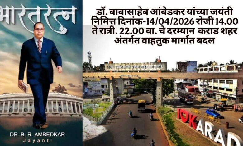 डॉ. बाबासाहेब आंबेडकर यांच्या जयंती निमित्त दिनांक-14/04/2026 रोजी 14.00 ते रात्री. 22.00 वा. चे दरम्यान कराड शहर अंतर्गत वाहतुक मार्गात बदल