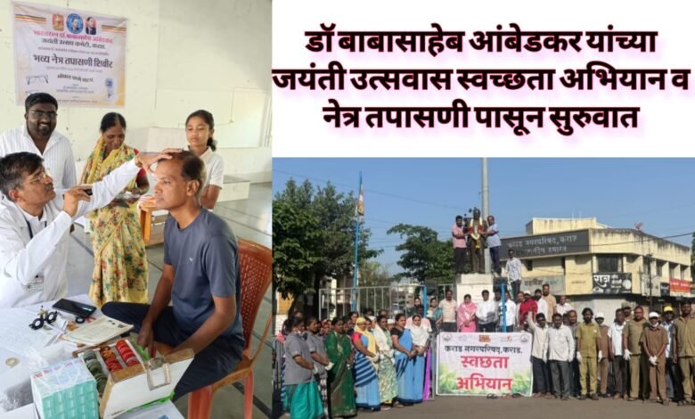 कराड प्रतिनिधी — या बाबत अधिक माहिती अशी की, भारतरत्न डॉ बाबासाहेब आंबेडकर यांच्या १३५ व्या जयंती निमित्त जयंती उत्सव कमेटीने ९ एप्रिल ते १५ एप्रिलपर्यंत विविध कार्यक्रमांचे आयोजन केले आहे. त्याची सुरुवात स्वच्छ सर्वेक्षण अभियानांतर्गत स्वच्छता अभियान व नेत्र तपासणी शिबिराचे आयोजन करून करण्यात आली.